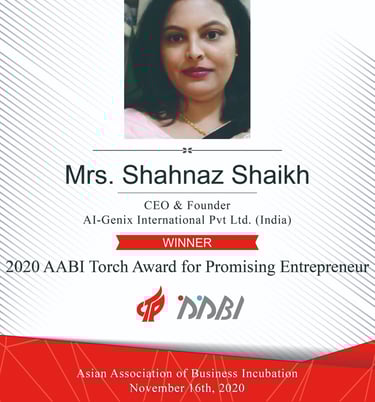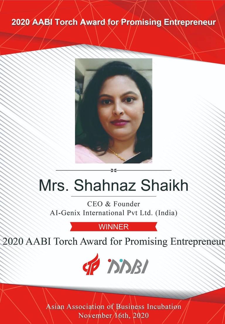 Promising Entrepreneur Award, AABI, Shanghai, China . Year 2020