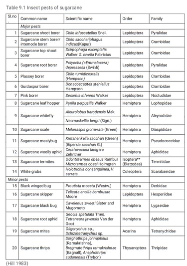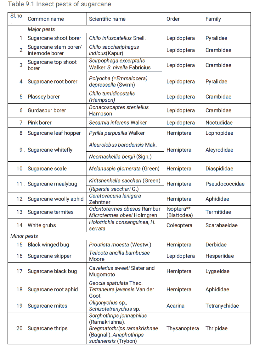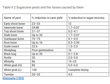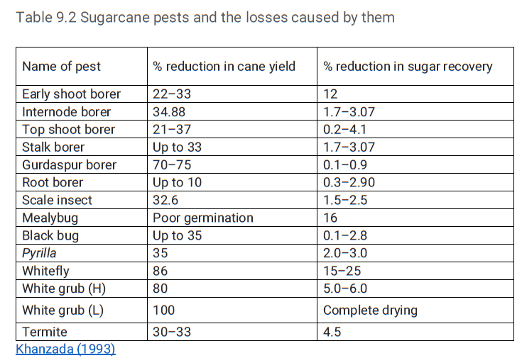 The list of major and minor insect pests of sugarcane and the losses caused by them is furnished in Table 9.1. The heavy losses caused by pests include total elimination of plant setts by termites, young shoots by shoot borers and older canes by stalk and top shoot borers also by white grubs, etc. lead to cane yield losses including sucrose content and sugar recovery (Table 9.2). M. V. Geetha et al