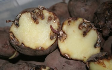 Potato foliage can be completely destroyed, resulting in substantial yield loss. Especially high infestations early in the season can directly affect tuber yield. There is strong correlation between leaf and consequent tuber infestation; this suggests that reducing the P. operculella population density during the potato-growing period is key to reducing tuber infestation at harvest. Hence, the most devastating yield losses (up to 70%) are largely a result of earlier tuber infestation in the field, generally where moths have laid eggs through soil cracks on the developing tubers, or when harvest is delayed. Potatoes in rustic stores can be damaged completely within a few months if the tubers are left untreated. Infested tubers are unsuitable not only for human consumption but also for use as seed. Infested tubers produce lower yields and initiate a fast development of a new field population. In tobacco, the moth is generally considered a minor pest; however, recently (since 2007) P. operculella has become a major pest in tobacco plantings in the U.S. state of North Carolina. In Mediterranean countries of North Africa (e.g., Egypt), the moth causes significant crop damage in tomato. The losses in stored potatoes ranging from 50% in Yemen and Peru; 86% in Tunisia, Algeria and Turkey; 90% in Kenya; and 100% in India and the Philippines have been reported (Aryal and Chuleni, 2015). In Egypt, potato tuber moth has caused up to 100% losses to potato in fields as well as in storage. P. operculella has been found to cause 30-70% infestation in country stores in India where modern cold storage facilities are inadequate. Up to 100% tuber infestation is reported from Karnataka (Nair and Rao, 1972; Saxena and Raj, 1979; Raman, 1982). Global climate change scenarios have alarmed the possibilities of the pest becoming more severe and expanding from its current habitat to newer area of potato production posing greater plant quarantine concerns (Sporleder 2008; Kroschel et al., 2013).