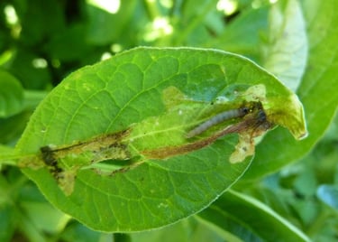 In potato, the larva attacks all vegetative plant parts of the crop. Typical symptoms of leaf damage are mines caused by larvae feeding in the mesophyll, without damaging the upper and lower epidermis. Other entry points are leaf axils and the growing points of young plants. The foliage can be completely destroyed. Moths lay eggs through soil cracks on the developing tubers, which can cause high tuber damage at harvest. Tuber infestation caused by first instar larvae can be hard to detect, such that even with precautionary measures infested tubers are transferred to potato stores. Characteristic piles of feces indicate infestation; inside tubers, larvae bore irregular galleries that may run into the interior of the tubers or remain directly under the skin.