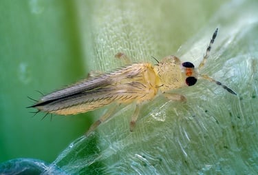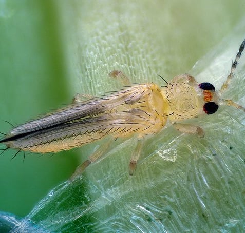 Thrips (order Thysanoptera) are minute, slender insects with fringed wings and unique asymmetrical mouthparts. Different thrips species feed mostly on plants by puncturing and sucking up the contents, although a few are predators.