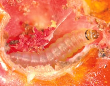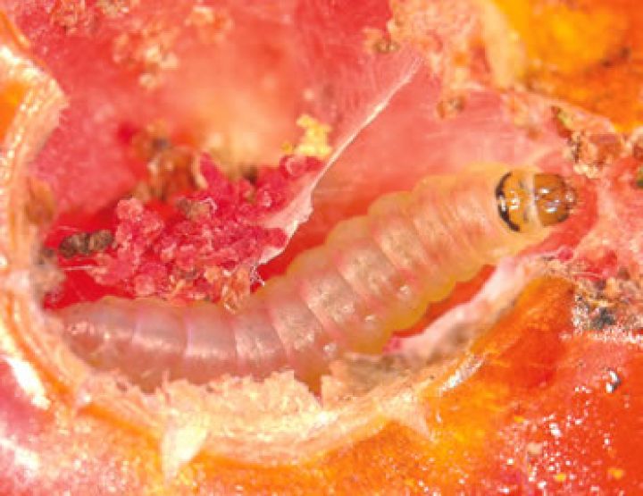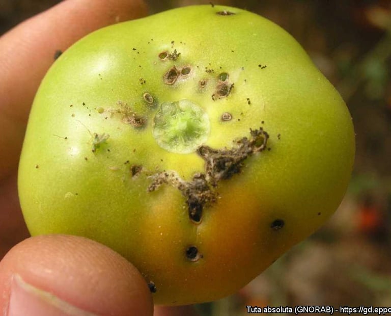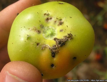 Damage can occur at any stage of tomato growth from seedlings to mature plants. The larvae feed on the mesophyll tissue, leaving the epidermis intact, thus creating irregular mines and galleries on the leaves. The mines and galleries may become necrotic with time. These mining activities lead to a reduction of the photosynthetic potential of infested leaves. Infested tomatoes with T. absoluta show burnt-up-like symptoms. The galleries made by the larvae are wider than that caused by the dipteran leaf miner Liriomyza trifolii. Larvae can penetrate the axillary buds of young stems when at high density. Thus, it leads to plant withering and checks of vegetative growth. After fruit setting, the larvae excavate tunnels in the fruits, which may facilitate invasion by pathogenic agents, resulting in fruit rot. The larvae of T. absoluta have a cryptic behavior and endophagous habit, which makes detection of infestation at an early stage difficult. Damage to stems causes necrosis that reduces tomato plant growth and development. Feeding tunnels and holes in the fruits lower their quality and reduce their market value. The serious damage to tomatoes, due to T. absoluta, is caused by leaf-mining activities and to a lesser extent by tunneling in the fruits. Damage to tomatoes can reach 100% if no action is taken against the moth. Estimation of economic losses is difficult due to the interaction of many factors including climate, production pattern (greenhouse versus open field), and production costs including seeds, insecticides, fertilization, and other resources.